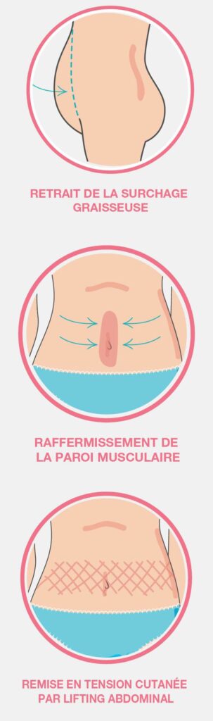 L’abdominoplastie est une réparation esthétique complète du ventre. Elle traite les problèmes à plusieurs niveaux :
