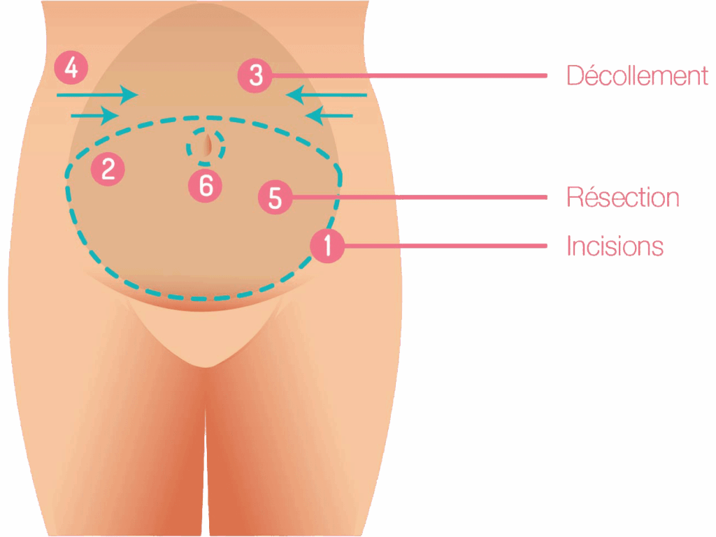 - Le nombril est réimplanté en position naturelle. La cicatrice finale est donc disposée au niveau des poils pubiens (cachée par le maillot) et au pourtour du nombril. Sa longueur dépendra de la quantité de peau à enlever.